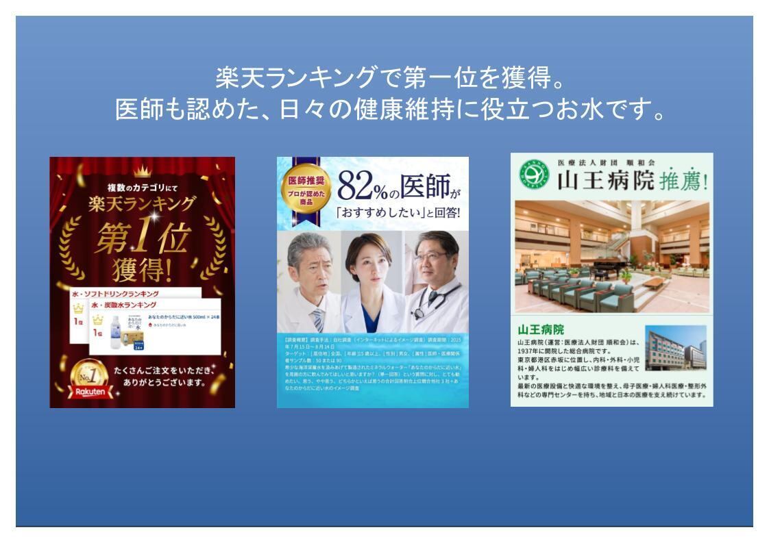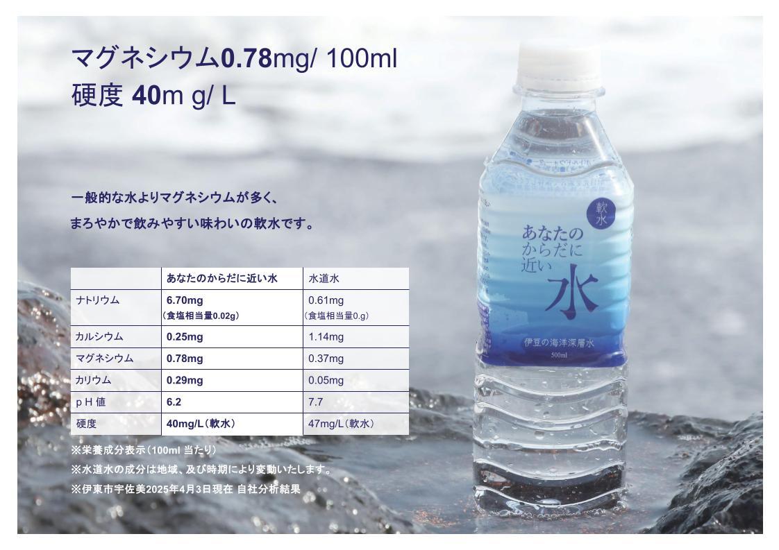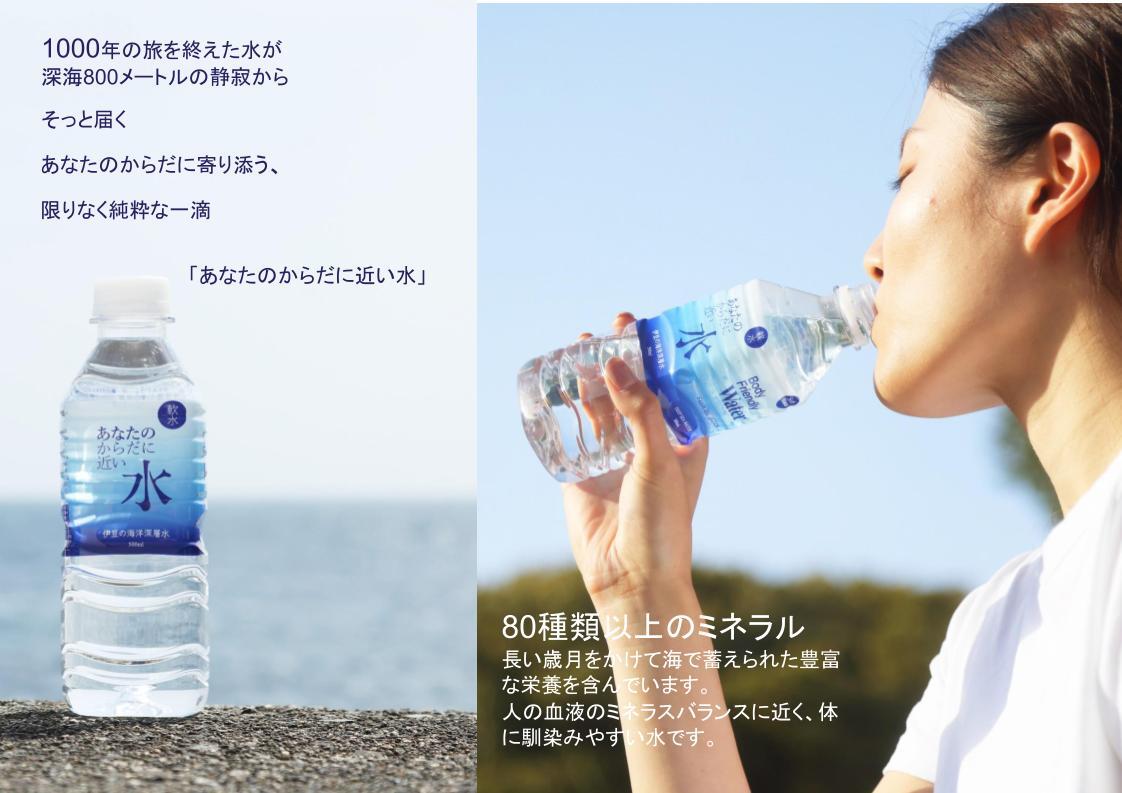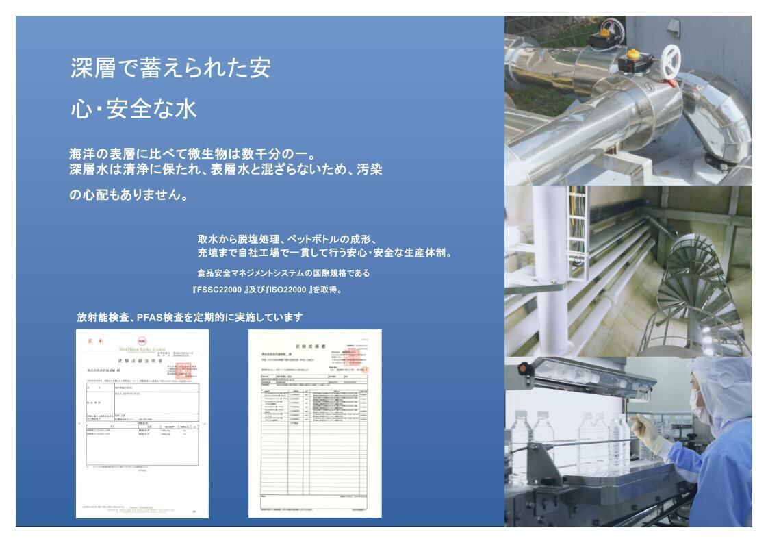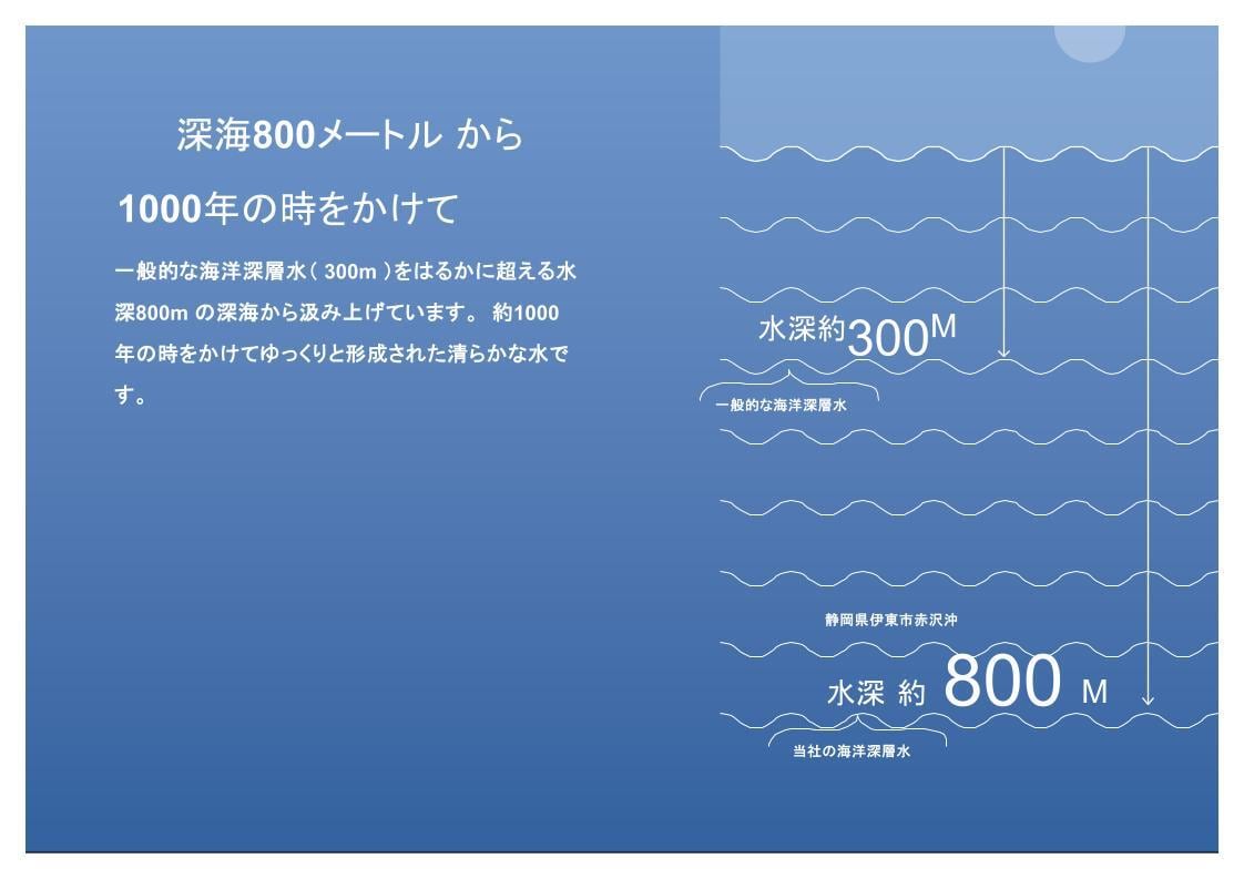 自然から授かった煮みの水は、水深800mの深海から法み上げて、80種類以上のミネラル